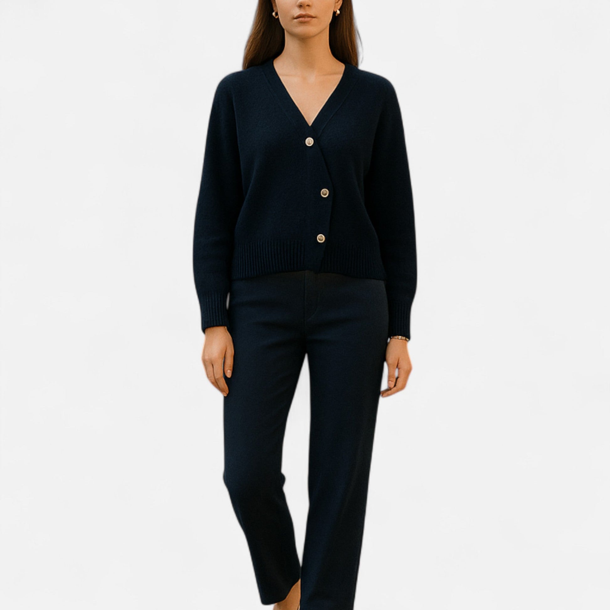 Este cárdigan combina la calidez noble de la lana premium con una silueta moderna que respira elegancia relajada. Su cuello en V y la línea de botones en diagonal añaden carácter y distinción a una prenda diseñada para mujeres que valoran lo clásico con una mirada contemporánea. Es perfecto para crear un estilo envolvente, sofisticado y natural.